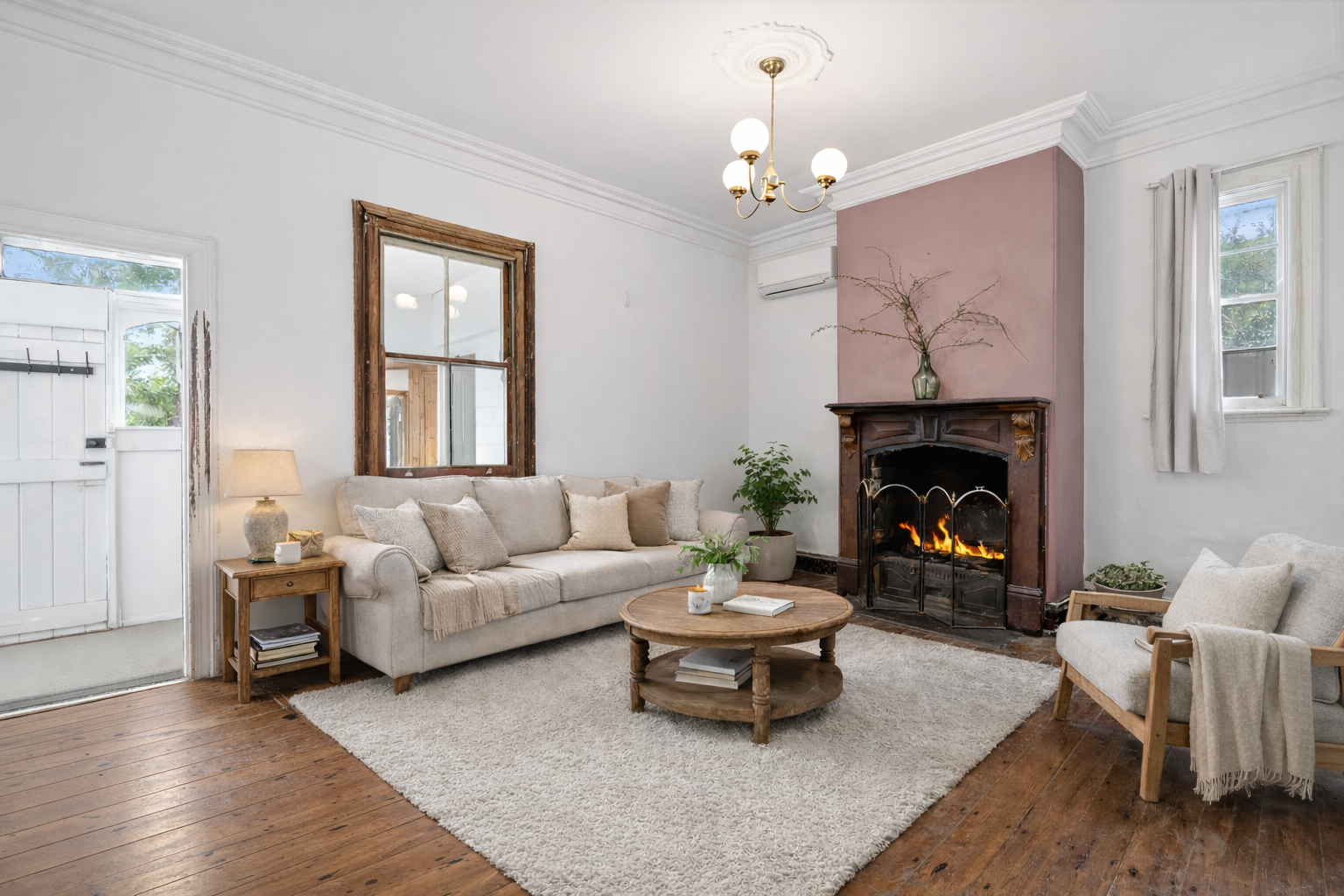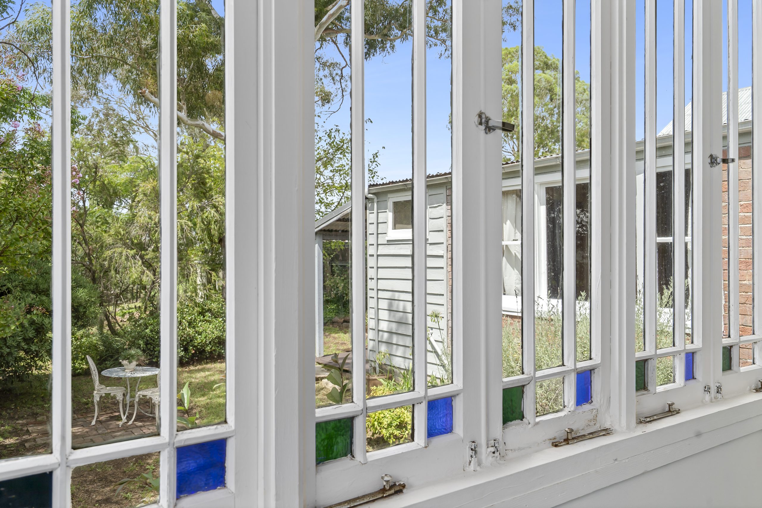 Inside, high ceilings, timber floorboards, original fireplaces with decorative timber mantles and stained-glass windows highlight the home’s character. The living room forms the centre of the home, anchored by a character fireplace that creates a welcoming space to relax and unwind. Reverse cycle air conditioning provides year-round comfort, while a sunny dine-in kitchen sits nearby and connects easily to the living area.