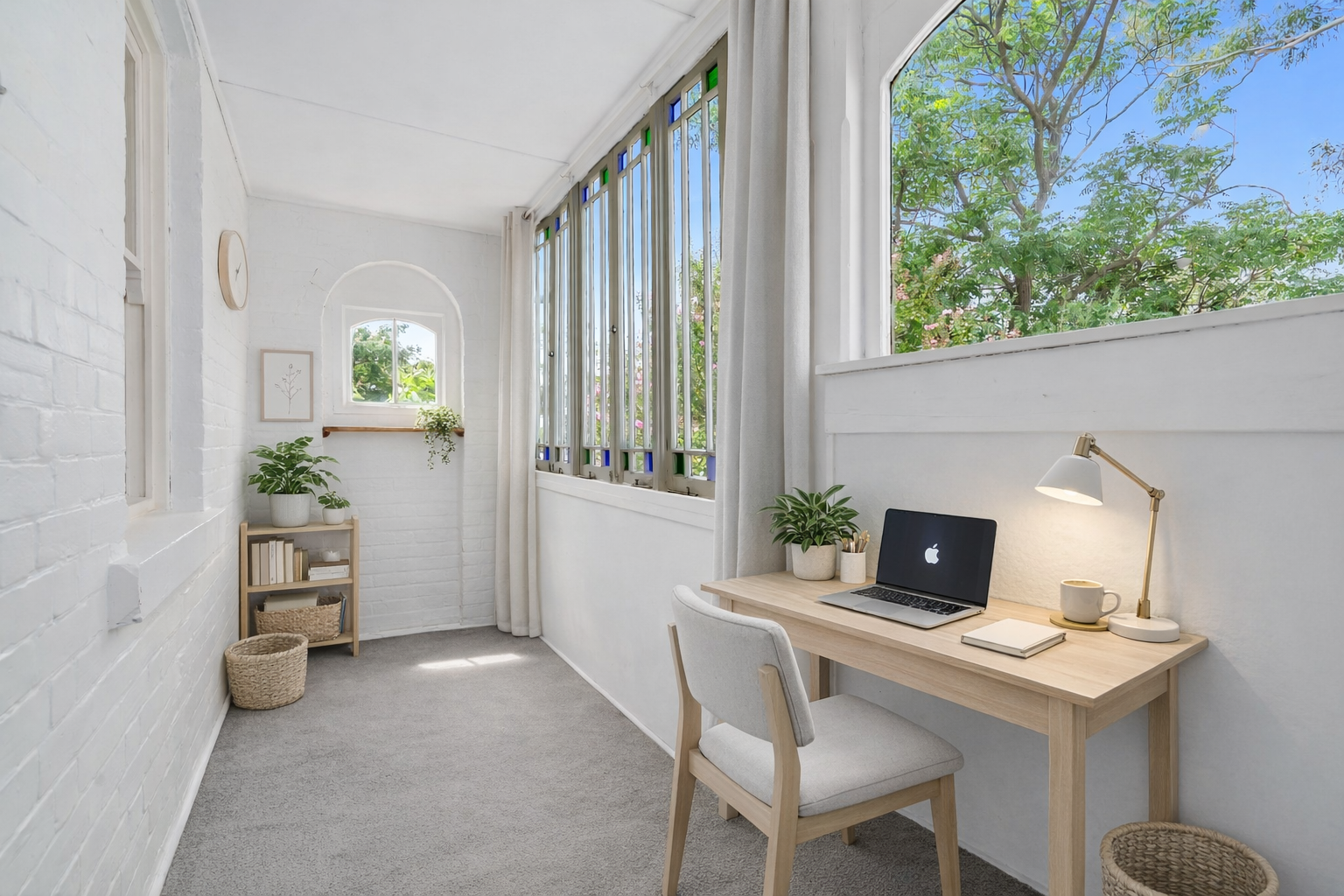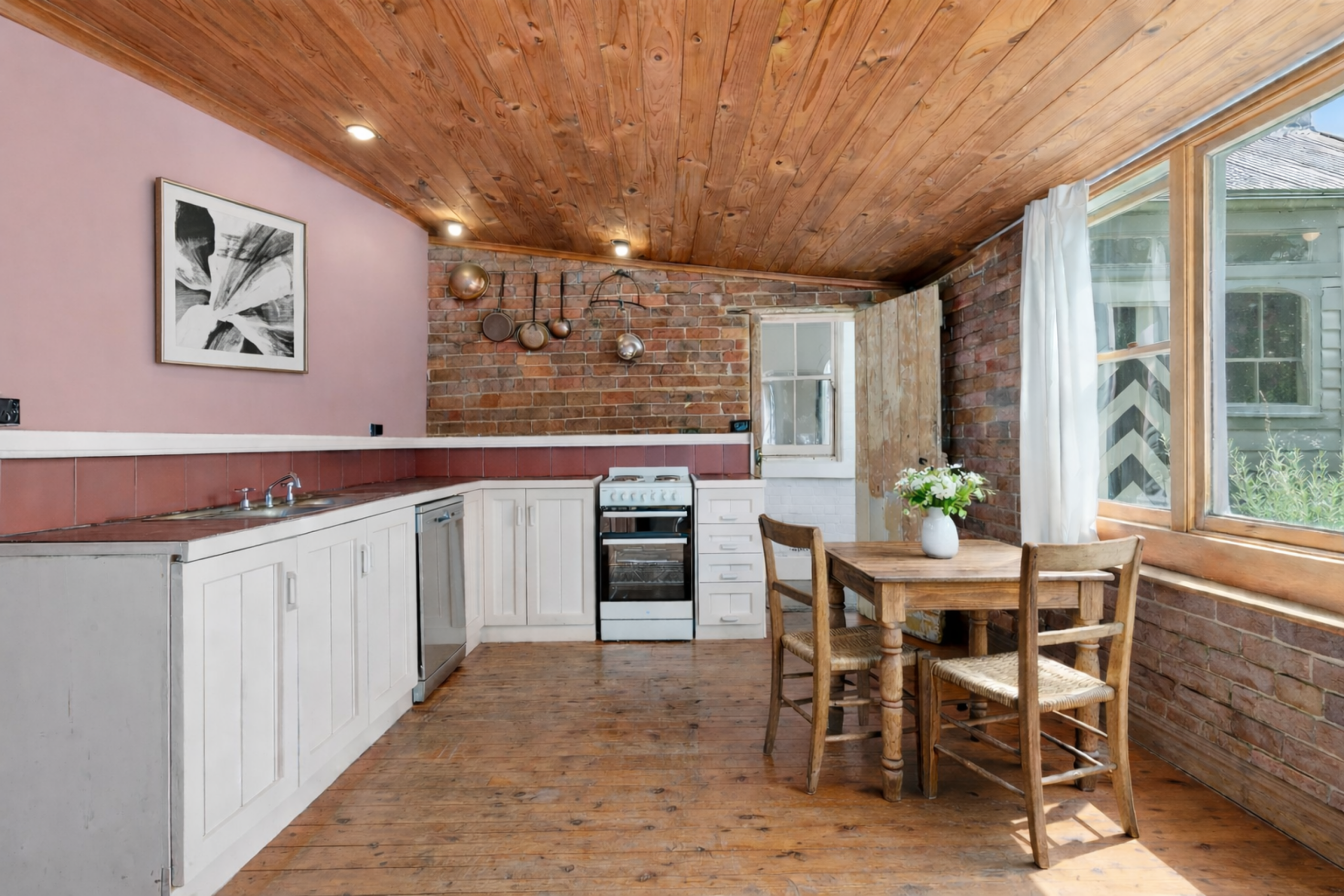 At the rear, a sunroom or study provides a peaceful space to read, work or simply enjoy the garden outlook. Outside, a small undercover deck offers the perfect place to sit with a morning cuppa and enjoy the peace and quiet of the established cottage garden, filled with flowers and fruit trees.
