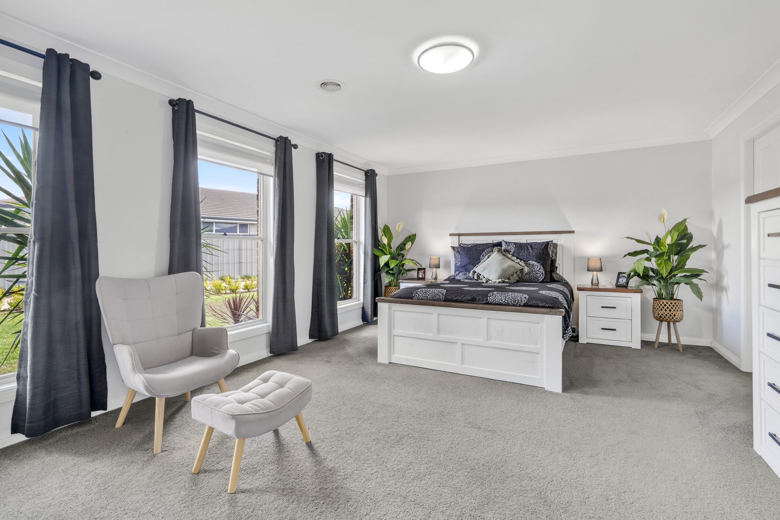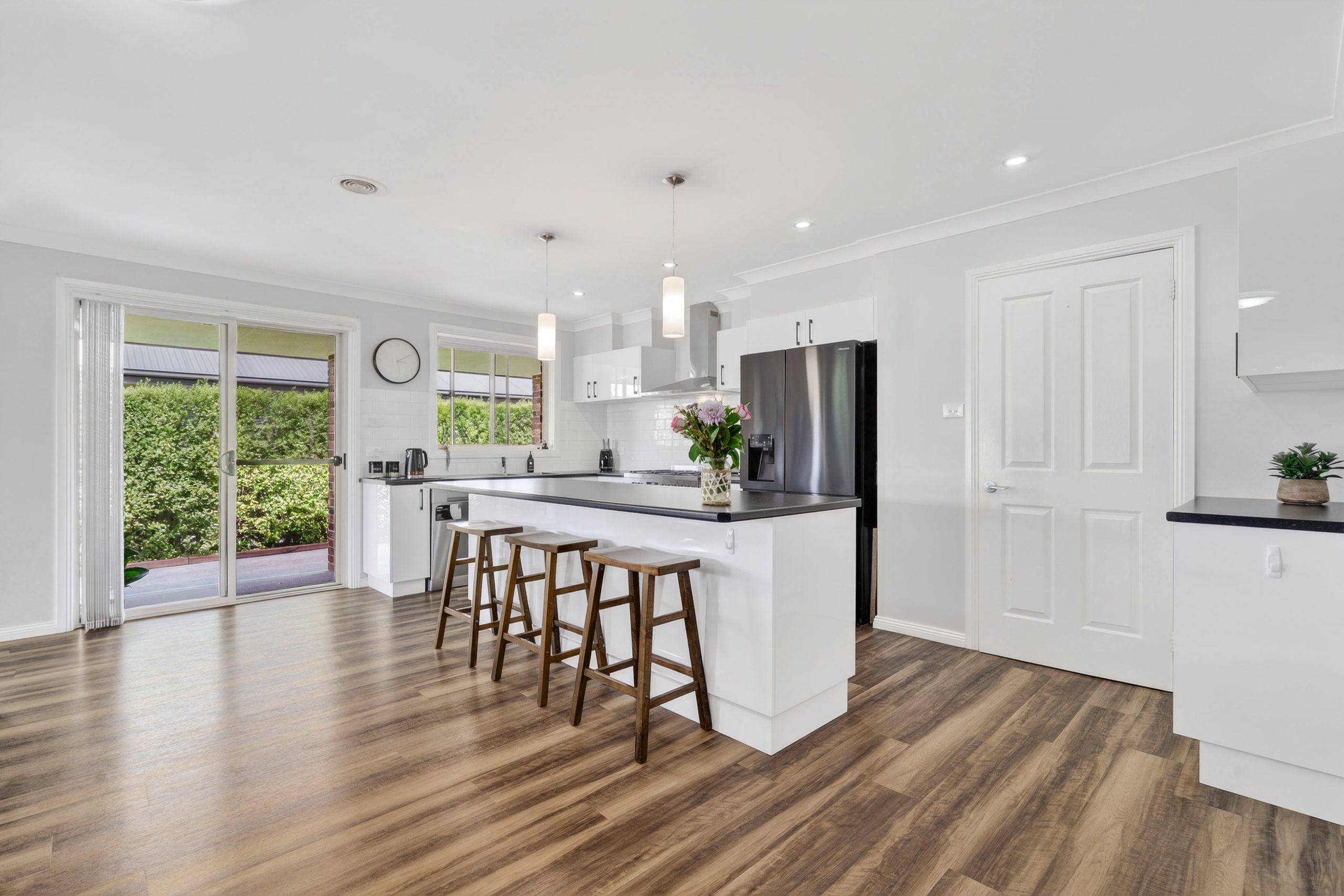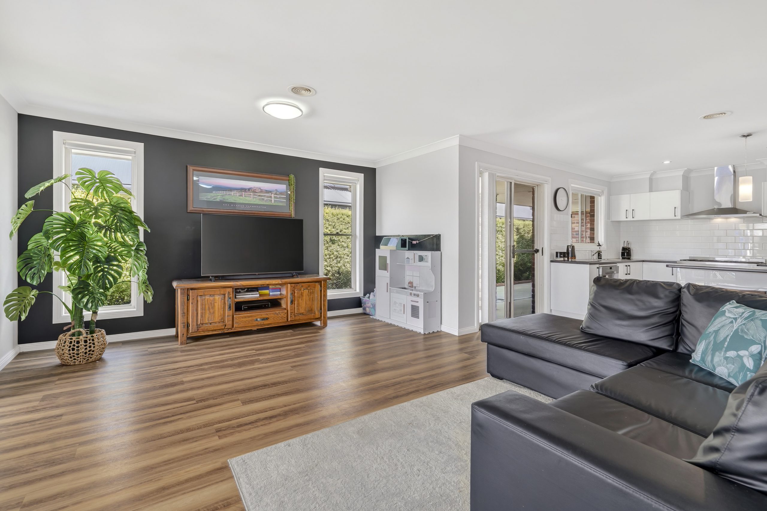 Outdoors, the covered alfresco overlooks a private, low-maintenance backyard, perfect for entertaining, relaxing or watching the kids play. A thriving vegetable patch with supporting water tanks adds a practical and sustainable lifestyle touch.